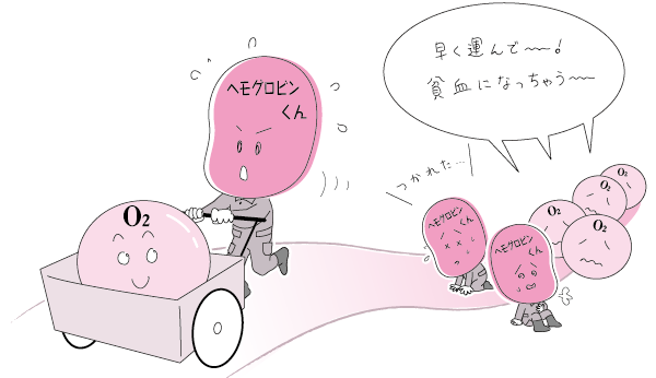 赤血球のおもな役割である酸素の末梢組織への運搬は、このヘモグロビンが行っています。このため、赤血球数が正常であっても、その中にヘモグロビンが十分に含まれていない場合には、酸素運搬能力は低下します。したがって、赤血球数よりヘモグロビンの量を、貧血の指標としている医師も少なくありません。