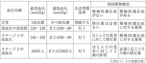 大規模臨床試験の結果に基づいて、何度か高血圧診断治療のための指針(ガイドライン)が改訂されています。2003年に改定された米国合同委員会の報告(表1