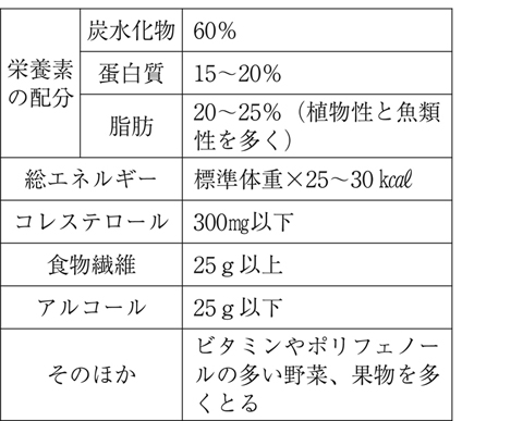 )、③適正体重(体重kg/(身長m)の2乗=22を標準とする)、④身体活動の増加(速歩、ジョギング、水泳、サイクリングなどを1日30~60分、週3回以上)が基本となります。