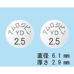 (表)アムロジピン錠2.5mg「YD」、YD960、2.5mg、(裏)AMLODIPINE2.5mg、アムロジピン錠2.5mg「YD」、2.5mg |