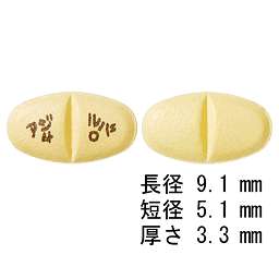黄色の錠剤、長径9.1mm、短径5.1mm、厚さ約3.3mm |