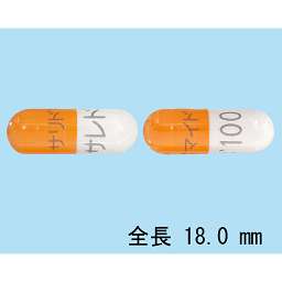 だいだい色不透明で「サリドマイド」表示/白色不透明で「サレド100」表示のカプセル剤、長径約18.0mm、短径約6.3mm |
