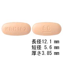 うすいだいだい色の錠剤、長径12.1mm、短径5.6mm |