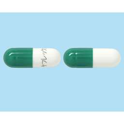 帯灰緑色/白色のカプセル剤、長さ17.9mm |