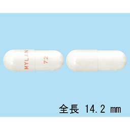 白色のカプセル剤、長径14.2mm、短径5.3mm |