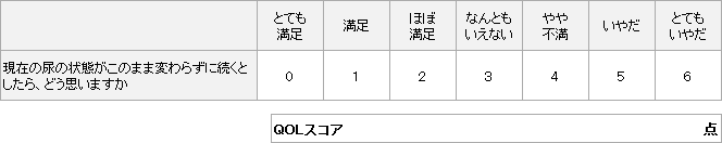 毎日目にする排尿の状態ですが、その変化を見ただけで判断するのは難しいもの。ご自身の排尿状態をチェックする方法として、国際前立腺症状スコア(IPSS)とQOLスコアがあります。国際前立腺症状スコア(IPSS)は、排尿障害の症状に関する7項目の質問からなり、それぞれ0~5点の評価を行い、各項目点数を合計(総計35点)し、軽症(0~7点)、中等症(8~19点)、重症(20~35点)に分類。QOLスコアは現在の排尿状態に対する患者自身の満足度を表す指標で、0点(とても満足)から6点(とてもいやだ)までの7段階で評価し、軽症(0~1点)、中等症(2~4点)、重症(5~6点)に区分されています。