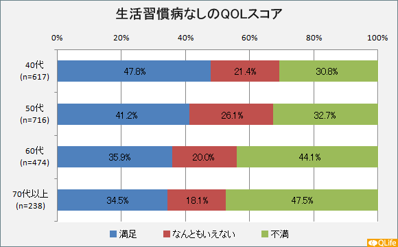 排尿状態の満足度を示すQOLスコアを年齢別ならびに生活習慣病の有無で調べたところ、メタボリックシンドロームなどの生活習慣病を持っている人では全体の約半数、年齢別では70代以上の6割以上が排尿状態について不満に感じると回答していました。一方、生活習慣病を持っていない人は、全体の3分の1、年齢別では70代以上の約半数が不満に感じると回答しています。このように生活習慣病を持っている人は持っていない人に比べて、排尿状態に対する満足度が低いことがわかります。