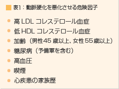 動脈硬化が進みやすい危険因子(リスクファクター)は、いくつかあります。高血圧、脂質異常(高LDLコレステロール血症、低HDLコレステロール血症)、糖尿病、喫煙、年齢(男性45歳以上、女性閉経後)、心疾患の家族歴(遺伝)などがあげられますが、持っているリスクの数が多いほど動脈硬化は進行しやすくなります(表1)。特に、生活習慣病にかかっている人は注意が必要です。