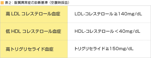 基本は、コレステロール値が高い状態を放置しておかないこと。このコレステロールの中でも、動脈硬化の原因となるのは、悪玉コレステロールといわれている、LDLコレステロール。動脈硬化性疾患予防ガイドラインでは、脂質異常症の診断基準をLDLコレステロール値140ml/dl以上と定めています(表2)。LDLコレステロールの値が高いと、動脈硬化になりやすくなります。