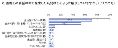 ・「医師との会話の中で発生した疑問はどのように解決していますか」という質問に対して、もっとも多かった回答は「主治医にもう一度聞く」の70.3%であった。