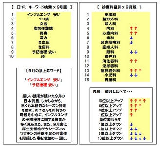 口コミ・キーワード検索では【うつ病】【女医】といった、普段から検索の多い単語を抑えて、【インフルエンザ 安い】が1位となった。9位に入った【予防接種 安い】と合わせて、今シーズンのインフルエンザに対する意識の高さがうかがえる。
