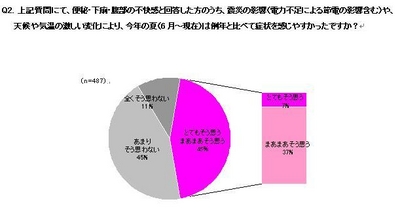 今年の夏(6月~現在)に感じた体の不調に関する質問に対し、「便秘や下痢などの腹部の不調」を1つでも該当すると答えた人は47.3%と、「肩こり」に次いで多い結果となり、この夏、2人に1人がお腹に異常を感じていたことがわかりました。また、この「腹部の不調や不快感」を覚える人のうち、例年よりもその症状を「より感じやすかった」と答えた人は44.4%に上っています。便秘や下痢などの腸内環境悪化の症状は、食生活や運動不足だけではなく、生活リズムや日ごろ感じるストレスなども大きく影響するといわれています。今回の結果から、いつ地震がくるか分からないという不安や緊張状態が続いたことや、震災後の節電の影響で照明やエアコンの使用自粛から慣れない環境が続き、ストレスを感じたことなどが主な原因と考えている方が多いと推察されます。