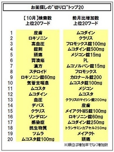 増加数ランキングでは、朝晩の冷え込みが厳しくなった10月を表すかのように、いわゆる“かぜ”症状に対して処方される薬剤の検索が増加した。具体的には、【ムコダイン】【ムコソルバン】をはじめとする去痰剤、【フロモックス】【クラリス】といった抗生物質、そして【メジコン】などの鎮咳剤といったかぜの諸症状を抑える薬剤名が上位に並ぶ結果となった。
