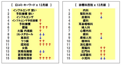 本格的なシーズン入りに伴い、【インフルエンザ 安い】、【予防接種 安い】などのインフルエンザ予防接種関連のキーワードが10月、11月に引き続き上位を独占。その他では、【腰痛】【脂漏性湿疹】などの検索が増加した。診療科目別では、上位に大きな変化が無かったものの、【肛門科】【泌尿器科】の検索が増加した。