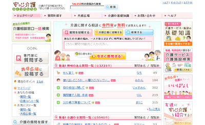 なお、同サービスでは、介護のQ&Aサービスのほか、介護者同士で愚痴や不満を気軽に言い合える「共感広場」や、地域別に介護の各種相談窓口を一括検索できる「介護相談窓口一括検索」、介護の初心者向けに介護サービスを分かりやすく解説する「介護サービス・施設の基礎知識」、全国の介護施設・サービスを地域・利用目的から探せる「介護サービス・施設検索」など多数のコンテンツも無料で利用することができます。