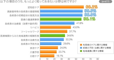 その他、TOP5に入った項目は「高齢者特有の各疾患の基礎情報(59.5%)」「各疾患の初期症状の発見方法(58.9%)」「医療介護連携事例(58.1%)」「各疾患の治療薬(効果や副作用)(47.8%)」であった。