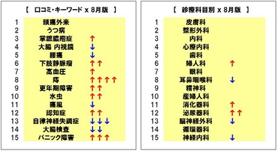 8月のランキングで最も特徴的だったのが、口コミ・キーワード検索において、【痔】のランキングが急上昇(10ランクアップの8位)したこと。通常、痔は寒い季節に患者が増加する疾患だが、厳しい暑さの影響で一日中エアコンを使う人も多く、逆に「冷え」で血行が悪くなって痔に悩まされる人が増加した可能性が考えられる。