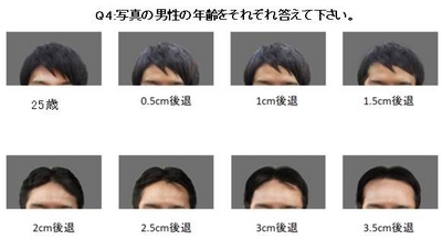 左上の25歳男性の頭髪を0.5cmずつ後退させたところ、1cm髪が後退すると 見た目年齢が3.6歳プラスして見えるという結果になりました。そして、もう1cm後退するとさらに7.6歳さらに1cm後退すると5.9歳プラス、平均すると、頭髪が1cm後退する毎に平均5.7歳年齢がプラスして見られることが判明し、頭髪が見た目年齢に大きく関係することが分かりました。
