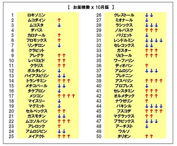 今回のランキングで最も注目されるのが、胃粘膜を守る薬である【ムコスタ】と【レバミピド】の、同一成分の新薬とジェネリックのランキングの急接近。2012年1月より、検索上位50位までを発表するこの方式になって以来、花粉症シーズンのピークで抗アレルギー薬の検索が増加した3月を除き、常にトップ3の位置にあった【ムコスタ】だが、今年に入り、そのジェネリックである【レバミピド】の検索数が月を追うごとに増加。10月にはついに初のトップ10入りを果たした。ジェネリックの普及促進に加え、全く同じ読み方の「レバミピド」が両剤の一般名であることから、一般名処方の増加に伴い、【レバミピド】の処方が増加したものと推察される。今後のランキング動向に注目したい。