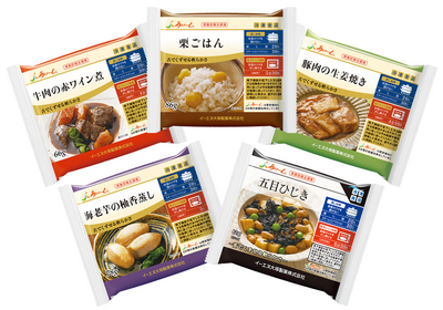摂食回復支援食「あいーと(R)」(*1)は、通常の食事を摂ることが難しい方の食べる機能と栄養状態の回復を支援するための食事(冷凍食品)で、独自の新技術「酵素均浸法(酵素均質浸透法)」(*2)により、食材本来の形、色、味および栄養素をそのままに保ち、舌でくずせる軟らかさに仕上げています。プロの料理人による味つけをはじめ、見た目、食べやすさ、カロリーや栄養素へのこだわり、含有栄養素、アレルギー物質の詳細を公開するなど、実際に食事をされる方が安心して食す事ができ、さらには食べる喜び、楽しみを感じられる製品です。おかず2品とごはん1品を1食の目安として、3食で約950~1,300kcalのエネルギーを無理なく摂取できるように配慮しています。調理は蒸し器または電子レンジで温めるだけの手軽さで、食事の準備時間を短縮し、介護をする側とされる側、双方にとって、介護における「食」の在り方を変える製品として、2010年の発売以来好評をいただいております。