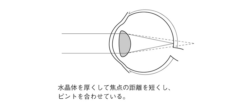 「老眼もスマホ老眼も、ピントの調節能力の低下によって、こうした症状が起こります。何かを見るとき、私達の眼は、カメラのレンズのような働きをする水晶体の厚さを調節し、ピントを合わせています。この調節に関わっているのが毛様体筋という筋肉で、水晶体を引っ張ったり、緩めたりしています。遠くを見るときは、毛様体筋が緩まり、水晶体を薄くしてピントを合わせています。一方、近くを見るときは、毛様体筋を収縮して水晶体を厚くして、ピントを合わせています。